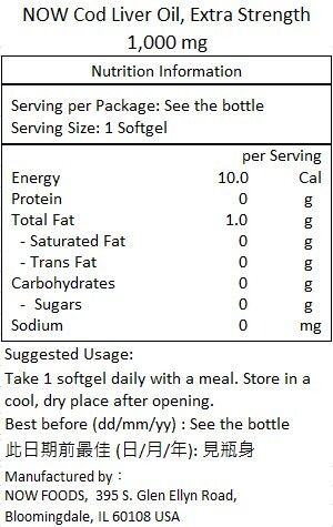 NOW Foods 三倍强效鱈魚肝油 1000毫克 180粒 加入維他命A和維他命D3 omega3 骨骼 心血管健康