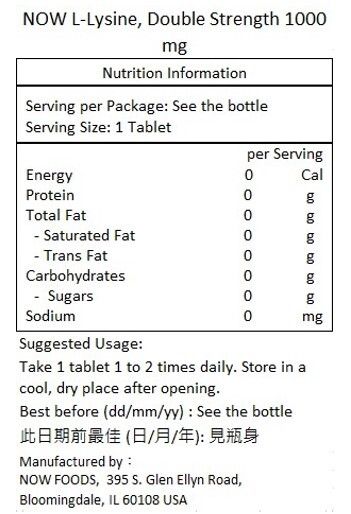 NOW Foods 雙倍功效 L-賴氨酸 1000 毫克 100片 -由L-賴氨酸鹽酸鹽組成 健身 皮膚健康 [香港行貨]