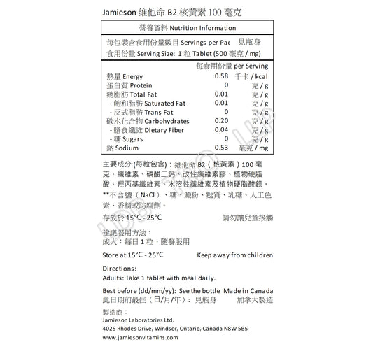 Jamieson - 維他命B2 核黃素 100 毫克 100粒 [平行進口]