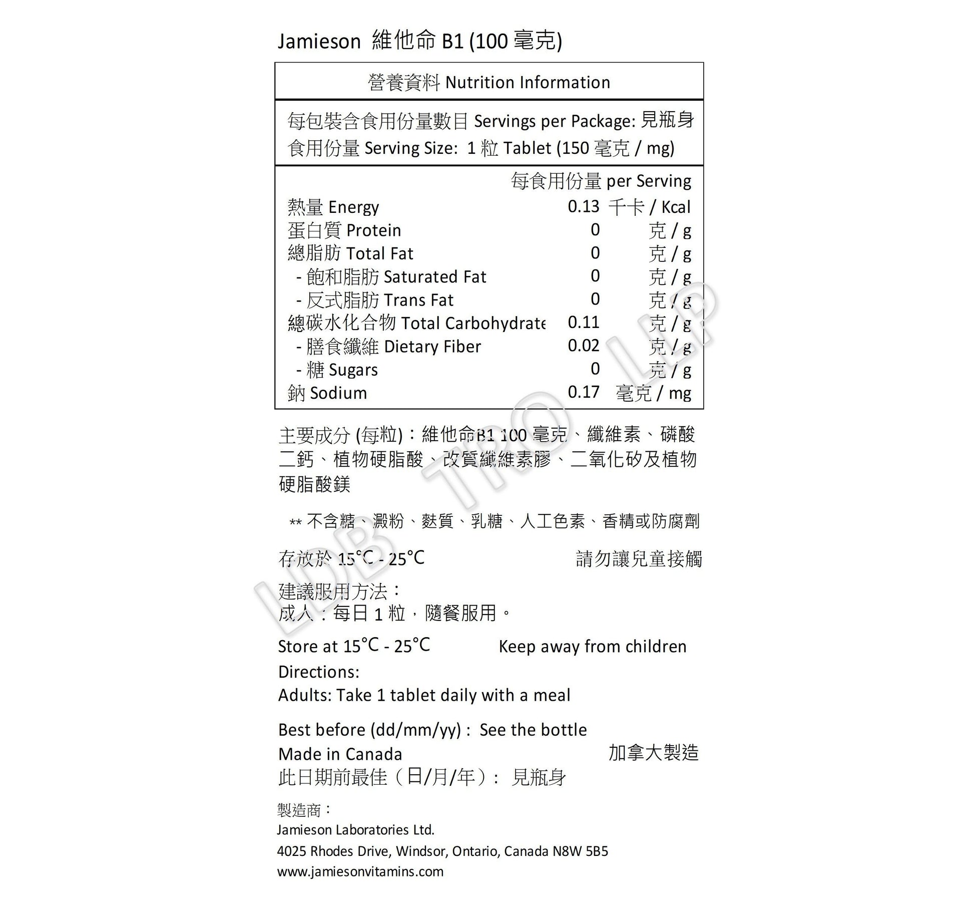 Jamieson 維生素 B1 硫胺素 100 毫克 100粒 [平行進口]