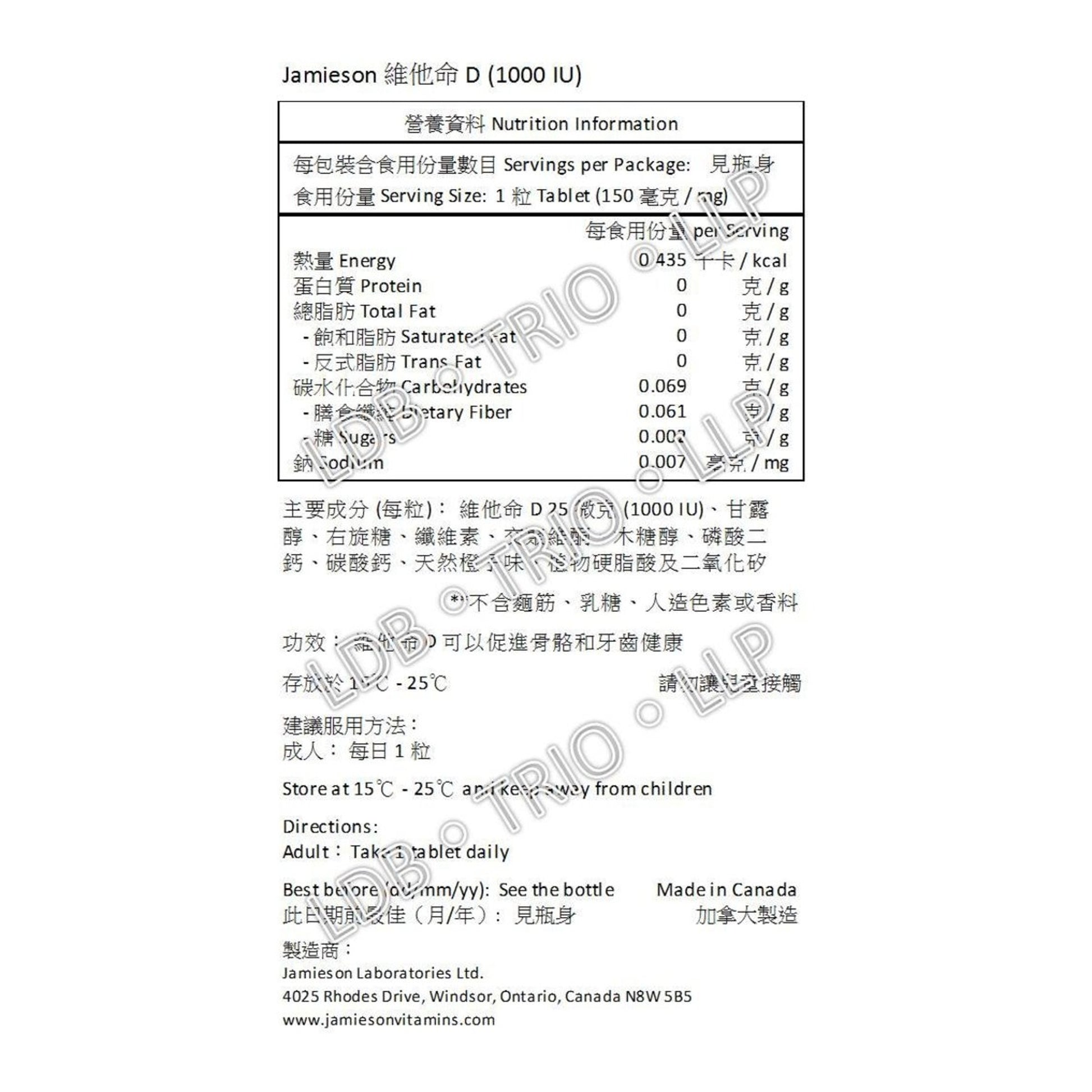 維他命 D 常被稱作 “陽光下的維他命”,幫助身體吸收鈣。 Jamieson 維他命 D 1000 IU 滿足你每一天的需要。主要成分及含量:維他命 D3 - 1,000 IU / 25 微毫克注意事項:以上產品為日常生活保健食品而非醫藥用品,無醫療功效。 以上產品沒有根據《藥劑業及毒藥條例》或《中醫藥條例》註冊。 為此以上產品作出的任何聲稱亦沒有為進行該等註冊而接受評核。 此產品並不供作診斷、治療或預防任何疾病之用。本資料只供參考,並不作診斷或治療之用。 由於原材料採購受季節影響,每批製成品的顏色或有不同,惟絕不影響產品質素及功效,安全食用。