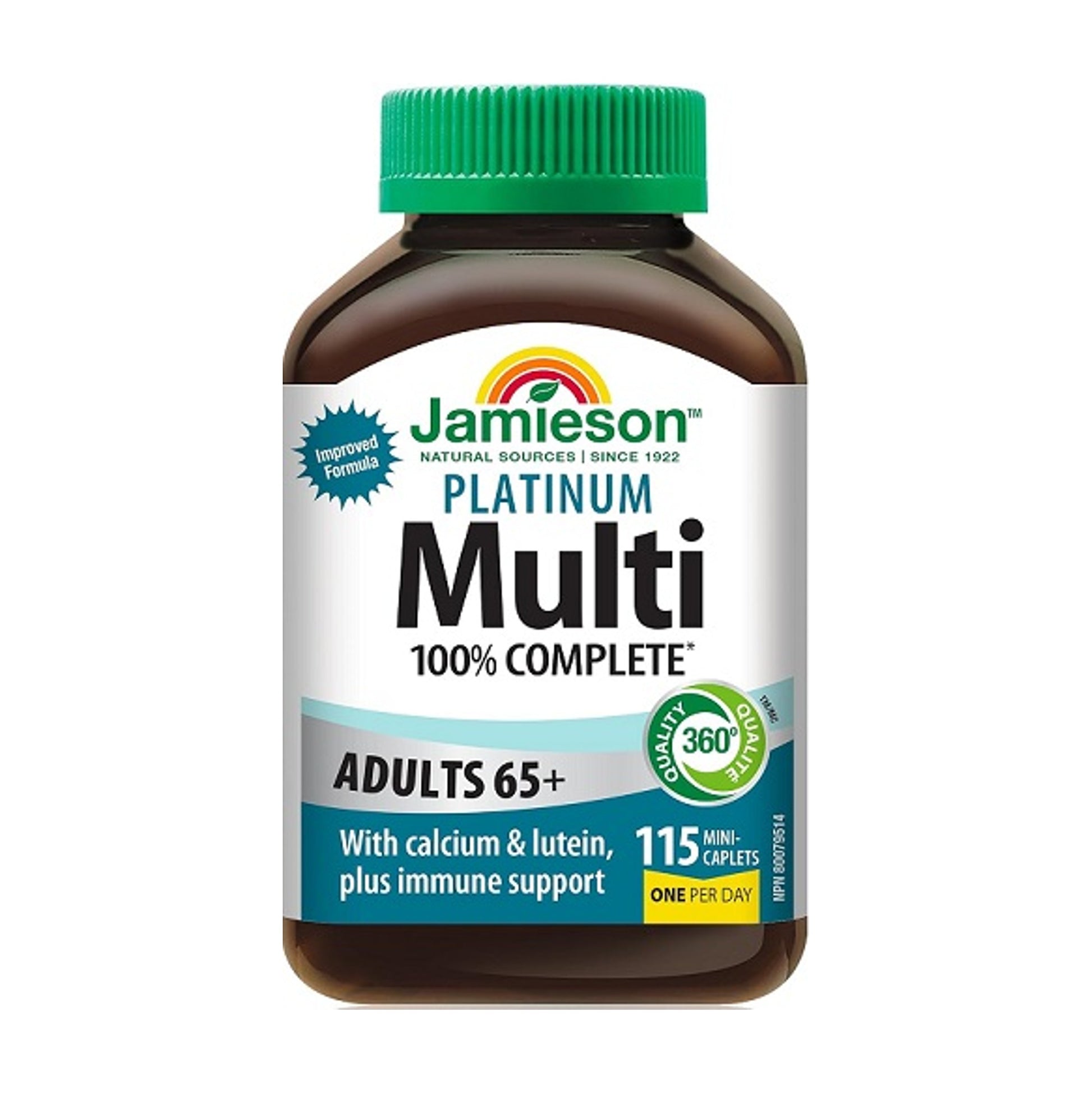 Jamieson 成人 65+ 白金多種維他命 90 粒迷你片 專為滿足 65 歲及以上加拿大人的需求而配製!易於吞嚥的迷你片不含維他命 K 和鐵,採用易於打開瓶裝。