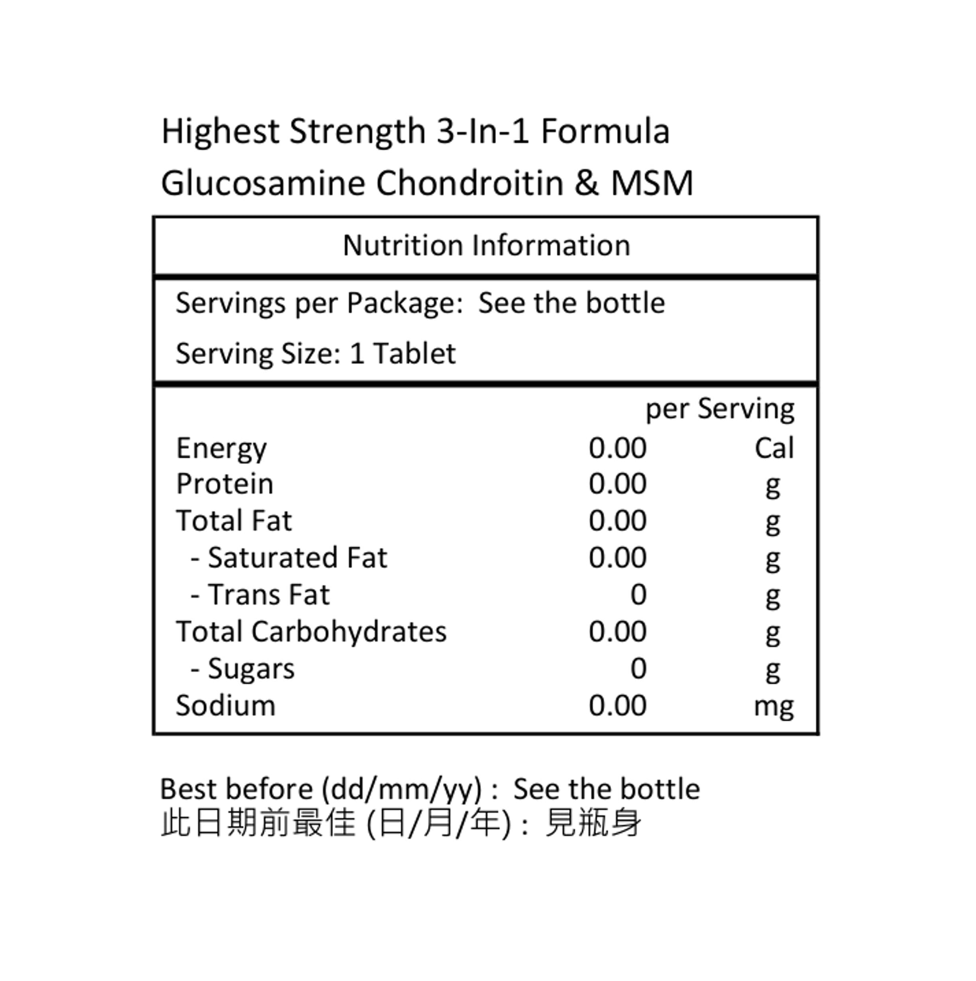 葡萄糖胺(源自貝類)750毫克,硫酸軟骨素600毫克,MSM(甲基磺酰基甲烷)450毫克